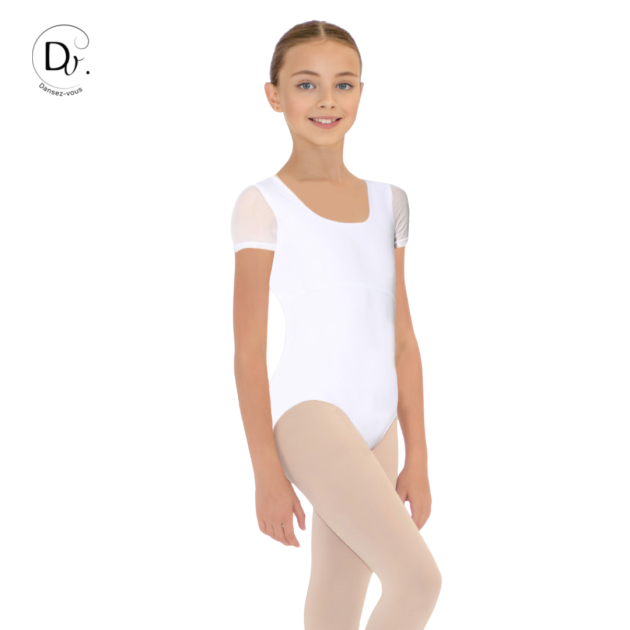 Leotard with mesh sleeves and a square back combines elegance and comfort for the juniors.
